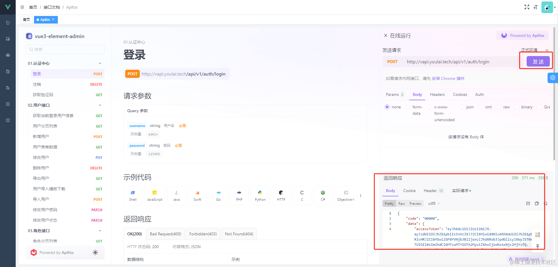 配套完整 Java 后端 权限管理接口,开箱即用,提供 OpenAPI 文档 搭配 Apifox 生成 Node、Python、Go等其他服务端代码;